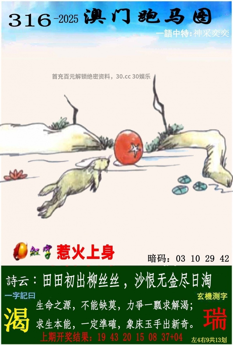 319期一字記曰:【奔】为口奔驰,为势所逼,羽翼未丰也抢食。一分收获,十分努力,适者生存要积极。《注》 |